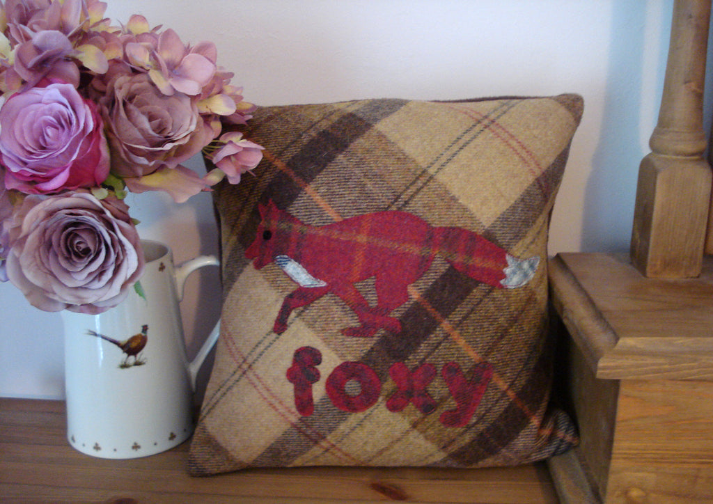 We love this brand new Foxy Fox Tweed cushion. It is perfect for traditional and contemporary homes. Approx 12"x12" this hand made cushion includes the polyester pad with a hand made Pure wool tweed cover that is appliqued in contrasting Tweed, the reverse is backed in Anti-pill polyester with an envelope opening.