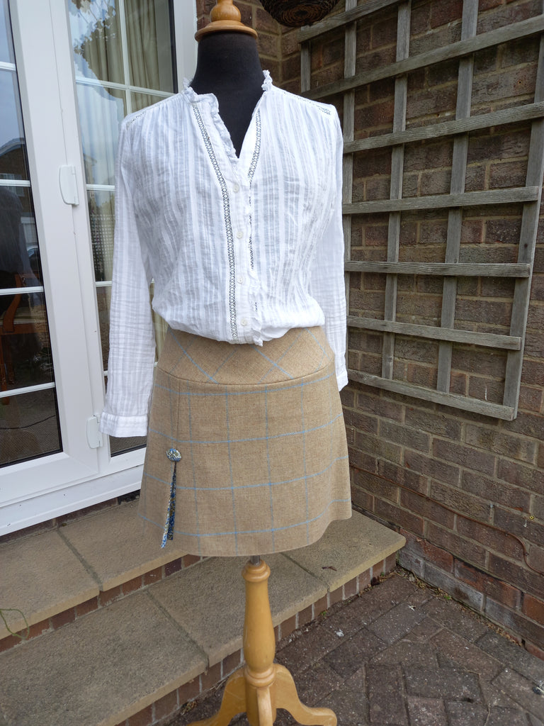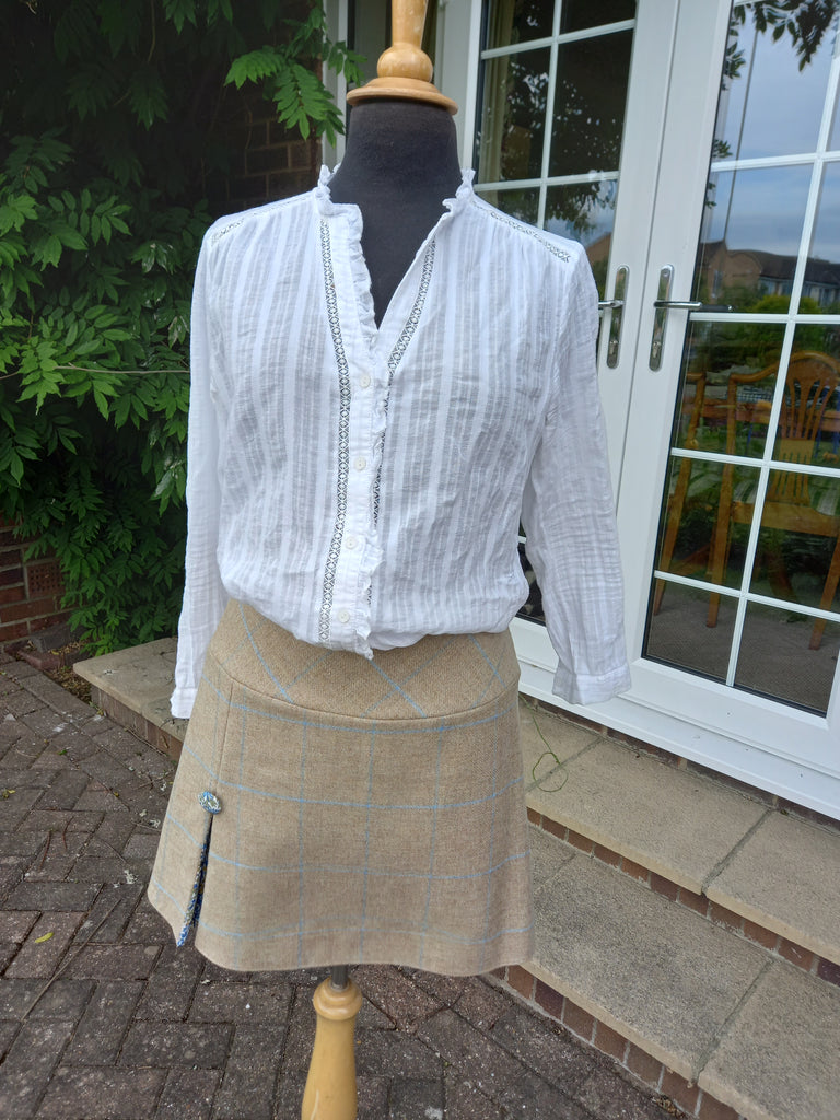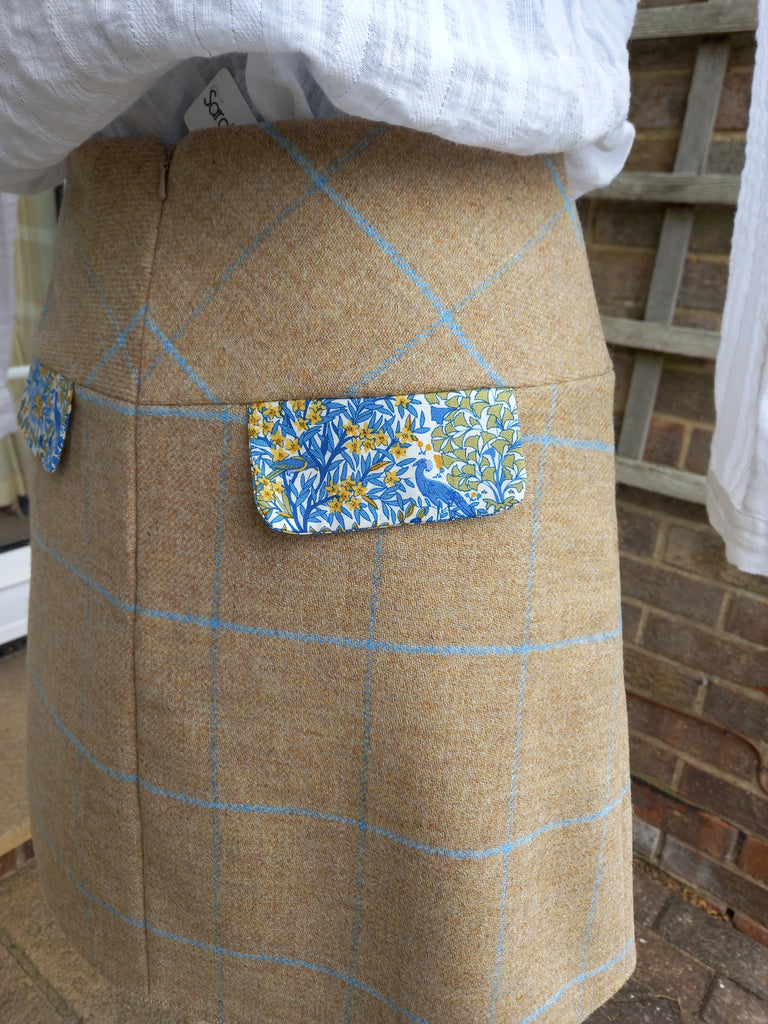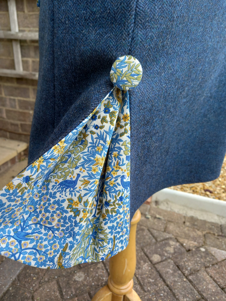 This Liberty Printed pheasant detail skirt is available in three Yorkshire Tweeds, Navy Blue and Green Herringbone Tweed as well as the Natual and Sky Window Pain Check. Taking you from summer to autumn these skirts are detailed with the pleat and covered button on the front and the mock pockets on the reverse. A beautiful A-line style to flatter and fastens with an invisible zip down the centre back.