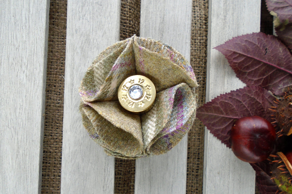 Jewelled hues shine out from the center of this sporting tweed brooch with a recycled empty game cartridge and gem complementing the colors within the tweed.
